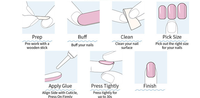 •    Τέλος τοποθετείστε τα νύχια Press On επάνω στα φυσικά νύχια και πιέστε για λίγα δευτερόλεπτα