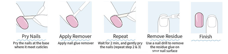 Για να κάνετε αφαίρεση των νυχιών Press On μουλιάστε τα νύχια σας σε ένα μπολ με ζεστό νερό, λάδι και υγρό σαπούνι για όση ώρα χρειαστεί. Έπειτα ανασηκώστε τα με το ξύλινο pusher. Με την χάρτινη λίμα αφαιρέστε με ελαφρύ τρίψιμο τα υπολείμματα κόλλας από τα φυσικά σας νύχια και τοποθετήστε κάποιο λαδάκι. Αφαιρέστε τα υπολείμματα κόλλας και από τα νύχια Press On και τοποθετήστε τα στο κουτί τους ώστε να τα χρησιμοποιήσετε ξανά.
